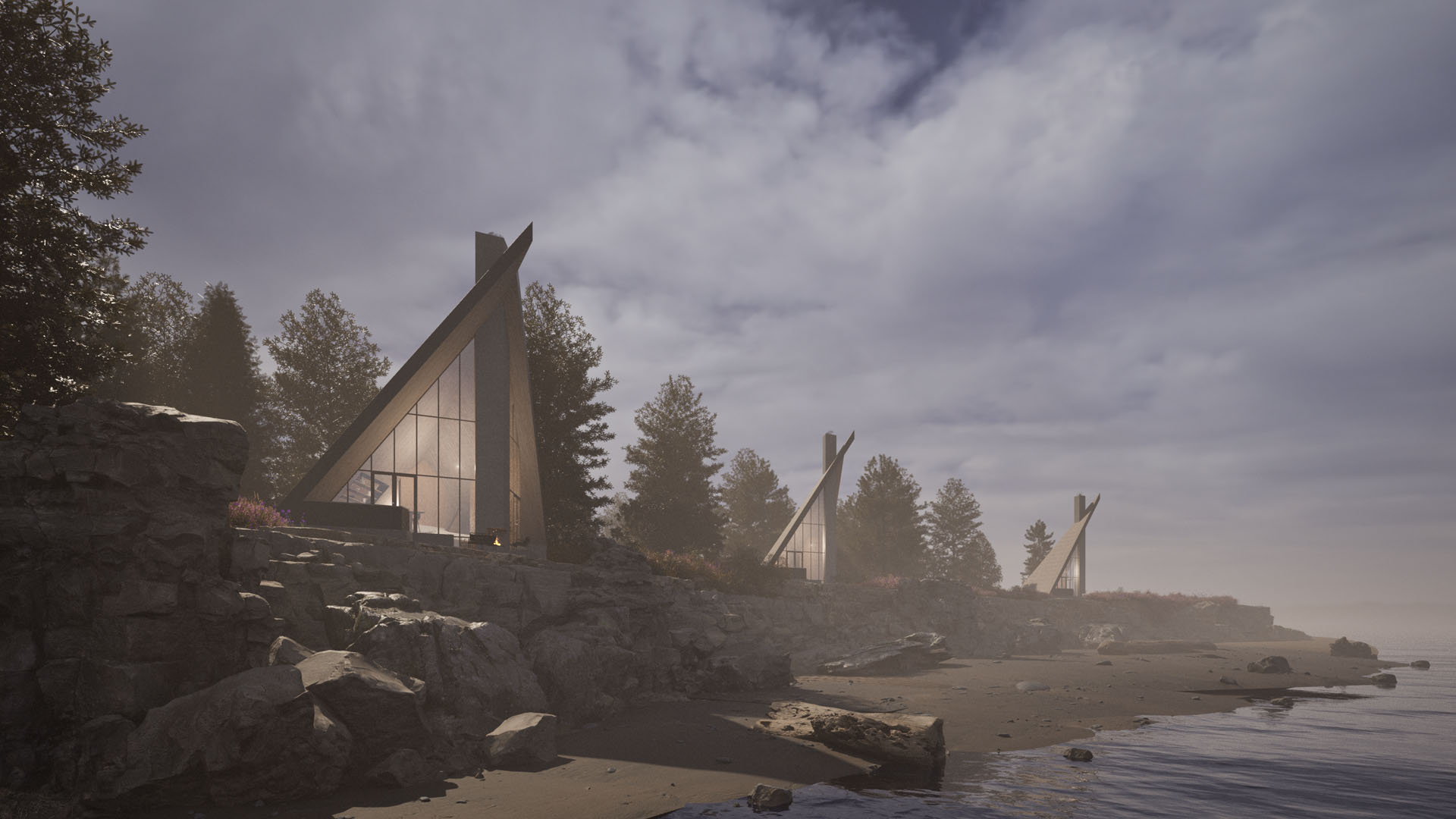 The Cabins at Blackrock Point are designed to immerse the inhabitants with the surrounding landscape. Offering privacy from the access road, the cabins open up to the dramatic water front. As a shell captures the sound of the sea, these cabins provide an intimate connection to the oceanside, funneling in all its sounds and sights. The unique diamond layout does not contain but extends out into the surrounding landscape. These cabins are meant to be a private booth for nature's dazzling show.